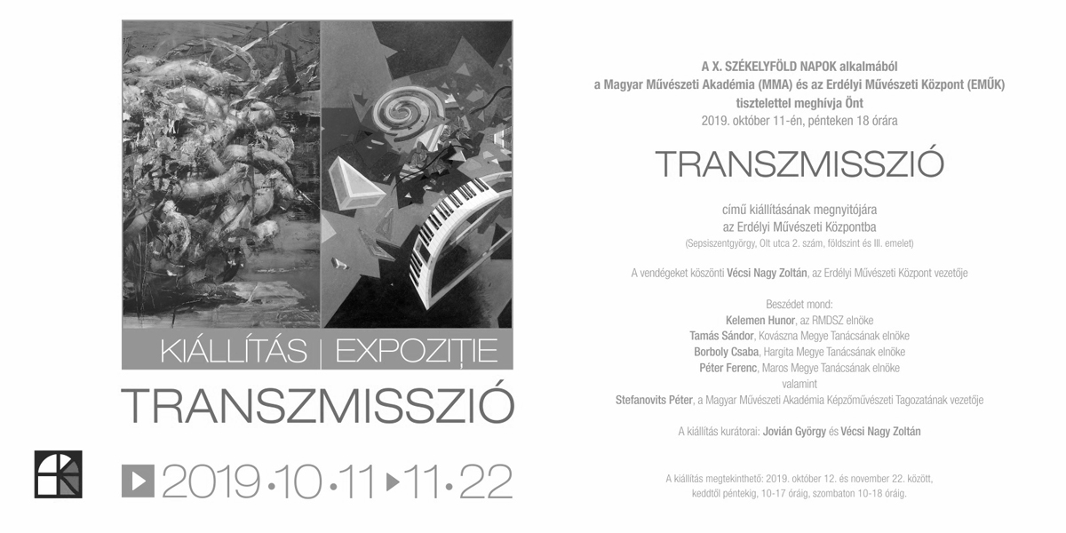 A Magyar Művészeti Akadémia Képzőművészeti Tagozata és az Erdélyi Művészeti Központ (EMŰK) által szervezett TRANSZMISSZIÓ című kiállítás október 11-én 18 órakor nyílik Sepsiszentgyörgyön. Másnap, 12-én szombat délelőtt 10 órai kezdettel szakmai konferenciát tartanak az erdélyi magyar képzőművészetről.