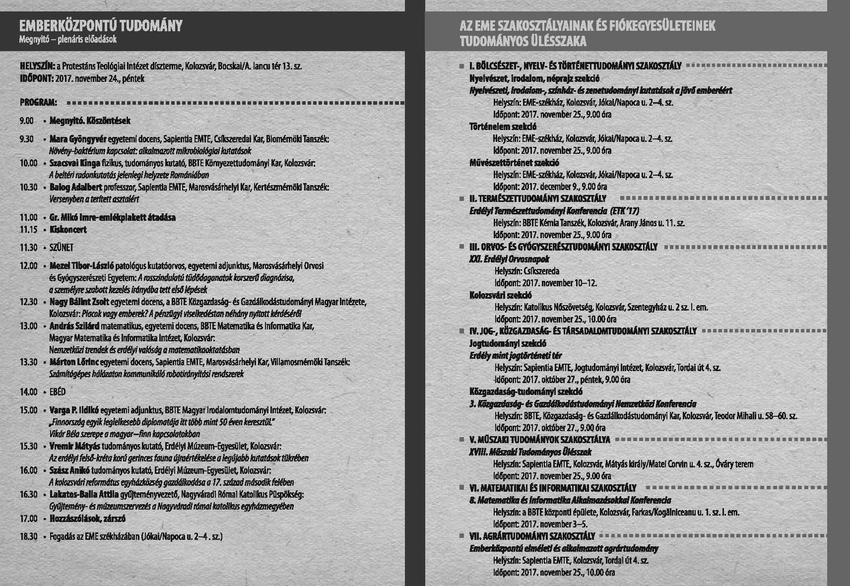 I. Bölcsészet-, Nyelv- és Történettudományi SzakosztályNyelvészet, irodalom, néprajz szekcióNyelvészeti, irodalom-, színház- és zenetudományi kutatások a jövő emberéért Helyszín: EME-székház, Kolozsvár, Jókai/Napoca u. 2–4. sz.Időpont: 2017. november 25., 9.00 óra.Történelem szekció Helyszín: EME-székház, Kolozsvár, Jókai/Napoca u. 2–4. sz.Időpont: 2017. november 25., 9.00 óra. Művészettörténet szekció Helyszín: EME-székház, Kolozsvár, Jókai/Napoca u. 2–4. sz.Időpont: 2017. december 9., 9.00 óra.II. Természettudományi SzakosztályErdélyi Természettudományi Konferencia(ETK’17)