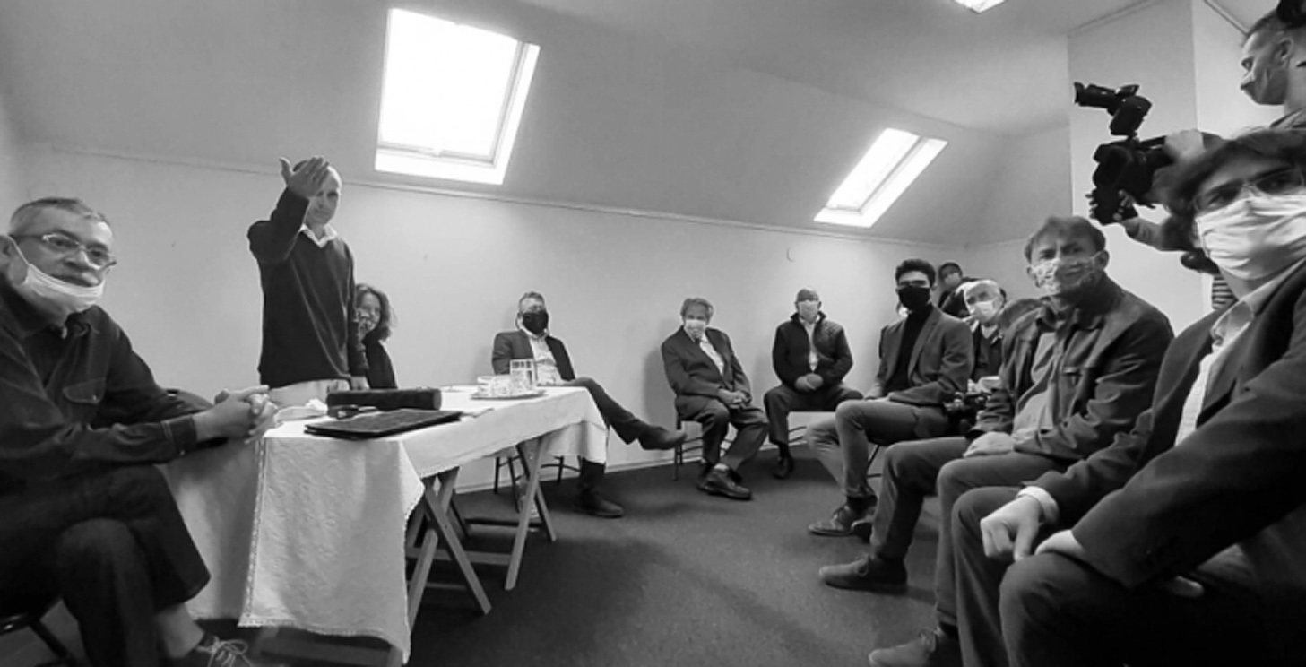 A nyitófotón, a járványügyi rendelkezéseknek megfelelően maszkban, jobbról balra: Szonda Szabolcs, Száraz Miklós György, Ádám Szilamér, Halász Péter, az asztal körül Fekete Vince, Mirk Szidónia Kata, Zsidó Ferenc, György Attila szerkesztők.