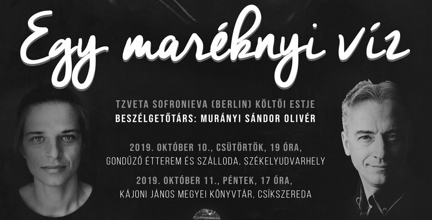 A fenti címmel Tzveta Sofronieva berlini bolgár költővel beszélget Murányi Sándor Olivér író október 10-én, csütörtökön 19 órától a székelyudvarhelyi Gondűző Étterem- és Szállodában, október 11-én, pénteken 17 órától pedig a csíkszeredai Kájoni János Megyei Könyvtárban.