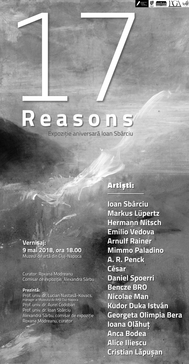 Ioan Sbârciu ünnepi kiállítás nyílik "17 Reasons" címmel a kolozsvári Szépművészeti Múzeumban május 9-én 18 órától. A kiállítás május 20-ig látogatható. Ioan Sbârciu munkái mellett olyan képzőművészek alkotásai lesznek megtekinthetők, mint Hermann Nitsch, Markus Lüpertz, Emilio Vedova, Arnulf Rainer, Mimmo Paladino, A. R. Penck, César, Daniel Spoerri, Nicolae Man, Kudor Duka István, Bencze Bro, Ioana Olăhuţ, Georgeta Olimpia Bera, Anca Bodea, Alice Iliescu és Cristian Gabriel Lăpuşan.