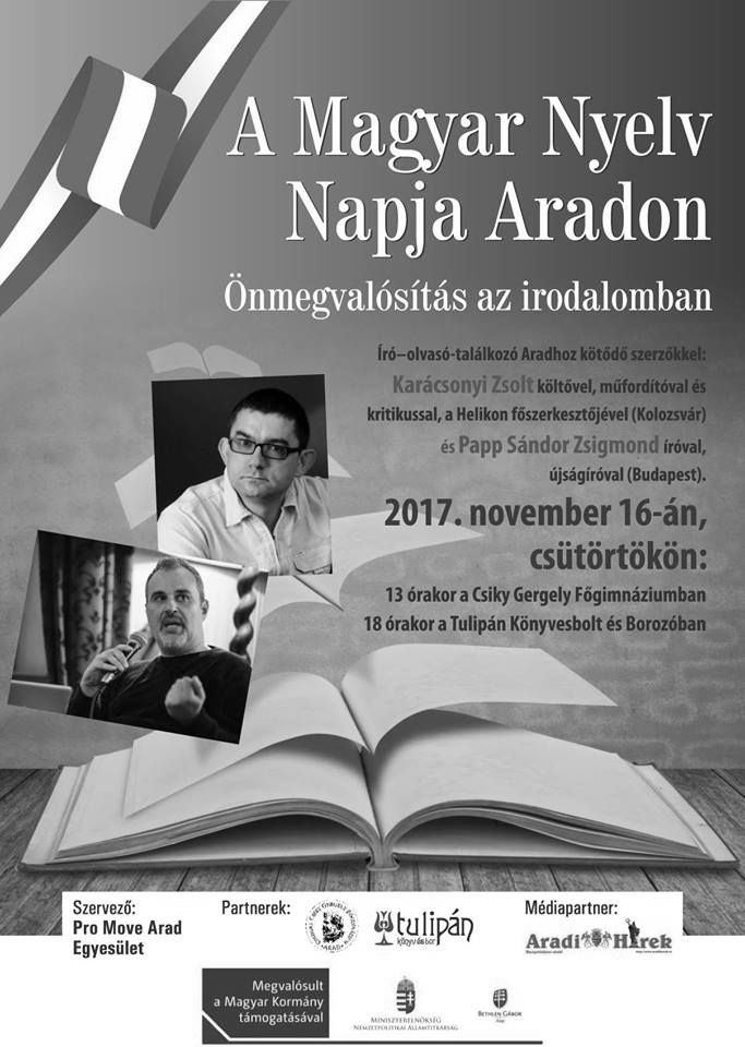 A Magyar Nyelv Napja (november 13.) alkalmából író–olvasó-találkozót tartanak Aradhoz kötődő kortárs szerzőkkel: Karácsonyi Zsolt költővel, műfordítóval és kritikussal, a Helikon főszerkesztőjével (Kolozsvár) és Papp Sándor Zsigmond íróval, újságíróval (Budapest).2017. november 16-án, csütörtökön 13 órától a Csiky Gergely Főgimnáziumban az iskola diákjainak mesélnek pályafutásukról, az irodalomban és a nyelvművelésben rejlő lehetőségekről, 18 órakor pedig a Tulipán Könyvesbolt és Borozóban találkoznak az irodalombarátokkal.Szervező: Pro Move Arad Egyesület, partnerek: Csiky Gergely Főgimnázium, Tulipán Könyvesbolt és Borozó, médiapartner: Aradi Hírek.A rendezvény a Magyar Kormány, a Nemzetpolitikai államtitkárság és a Bethlen Gábor Alap támogatásával valósul meg.