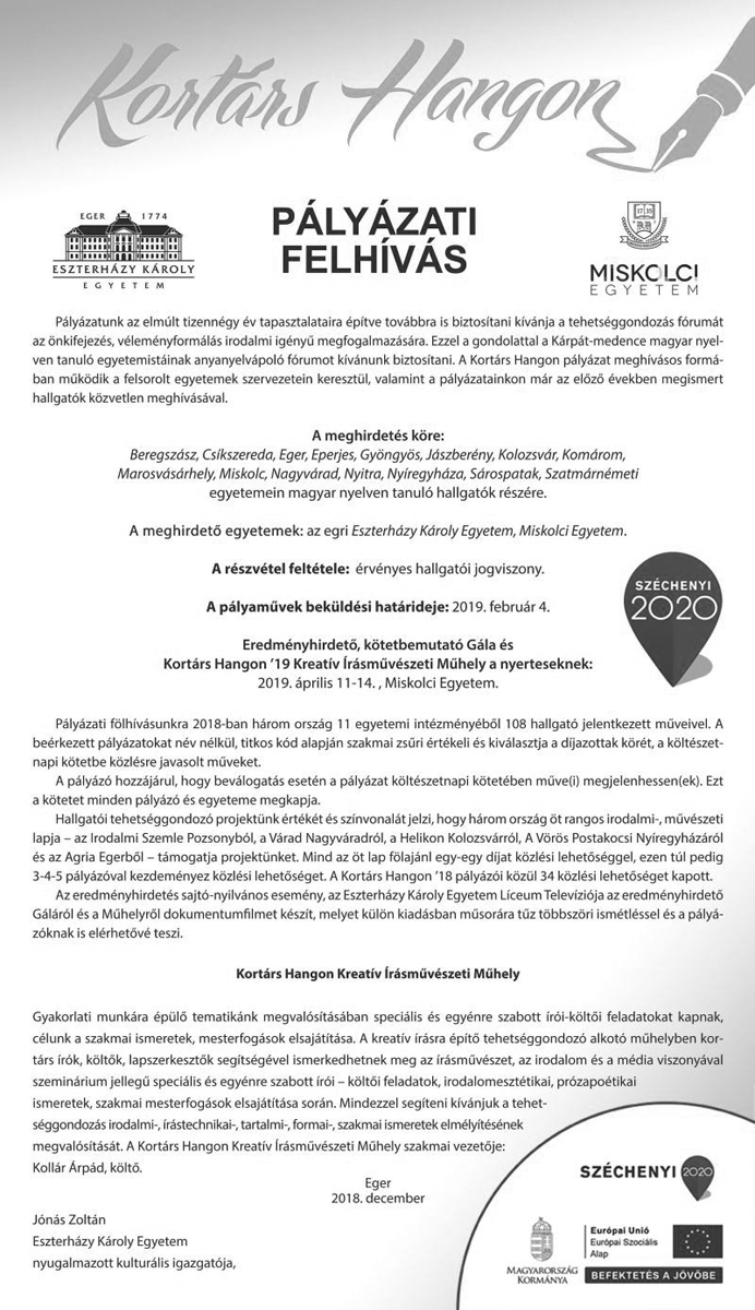 Idén is meghirdetik, immár 14-ik alkalommal a Kortárs Hangon irodalmi pályázatot. A meghirdetés köre: Beregszász, Csíkszereda, Eger, Eperjes, Gyöngyös, Jászberény, Kolozsvár, Komárom, Marosvásárhely, Miskolc, Nagyvárad, Nyitra, Nyíregyháza, Sárospatak, Szatmárnémeti egytemein magyar nyelven tanuló diákok. Pályázati feltétel: érvényes hallgatói jogviszony. A pályázatra vers és próza kategóriában lehet benyújtani pályaműveket pályázonként maximum 2 alkotással, alkotásonként maximum 2 gépelt oldalnyi művel lehet jelentkezni. A sikeres művek szerzői megjelennek a pályázat költészet napi kötetében, értékes könyvutalványokban részesülnek, részvételi lehetőségük nyílik részt venni alkotói szakmai műhelyben, illetve irodalmi lapokban biztosítanak számukra közlési lehetőséget. A pályaműveket és a kitöltött jelentkezési lapokat a kortarshangon@uni-eszterhazy.hu címre várják. Beküldési határidő: 2019. február 4. Eredményhirdető, kötetbemutató Gála és Kortárs Hangon '19 Kreatív Írásművészeti Műhely a nyerteseknek: 2019. április 11-14., Miskolci Egyetem.