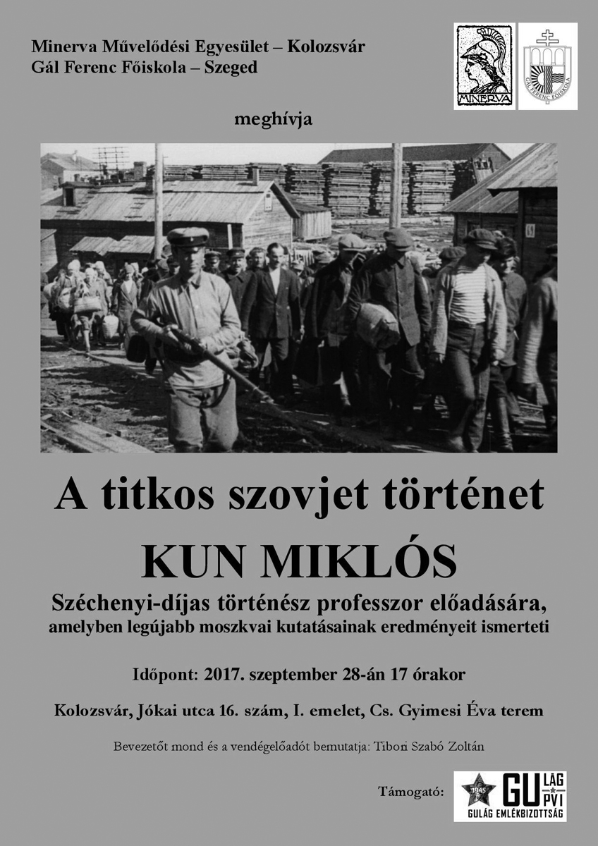 A Minerva Művelődési Egyesület és a szegedi Gál Ferenc Főiskola szervezésében kerül sor szeptember 28-án 17 órakor Kun Miklós Széchenyi díjas történészprofesszor előadására a Minerva Ház (Jókai/Napoca utca 16.) Cs. Gyimesi Éva termében.