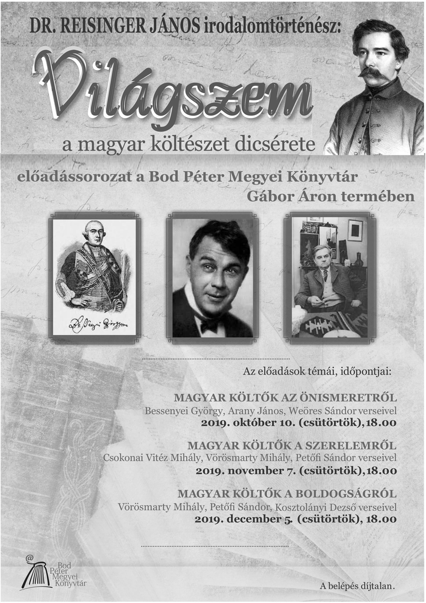 Dr. Reisinger János művészet- és irodalomtörténész Világszem-sorozatának idei utolsó előadására kerül sor 2019. december 5-én, 18 órától, a Bod Péter Megyei Könyvtár Gábor Áron termében. A magyar költészet fontos vetületeire és alkotóira reflektáló, versmondással, verselemzésekkel tarkított előadás címe: Magyar költők a boldogságról– Vörösmarty Mihály, Petőfi Sándor, Kosztolányi Dezső verseivel.